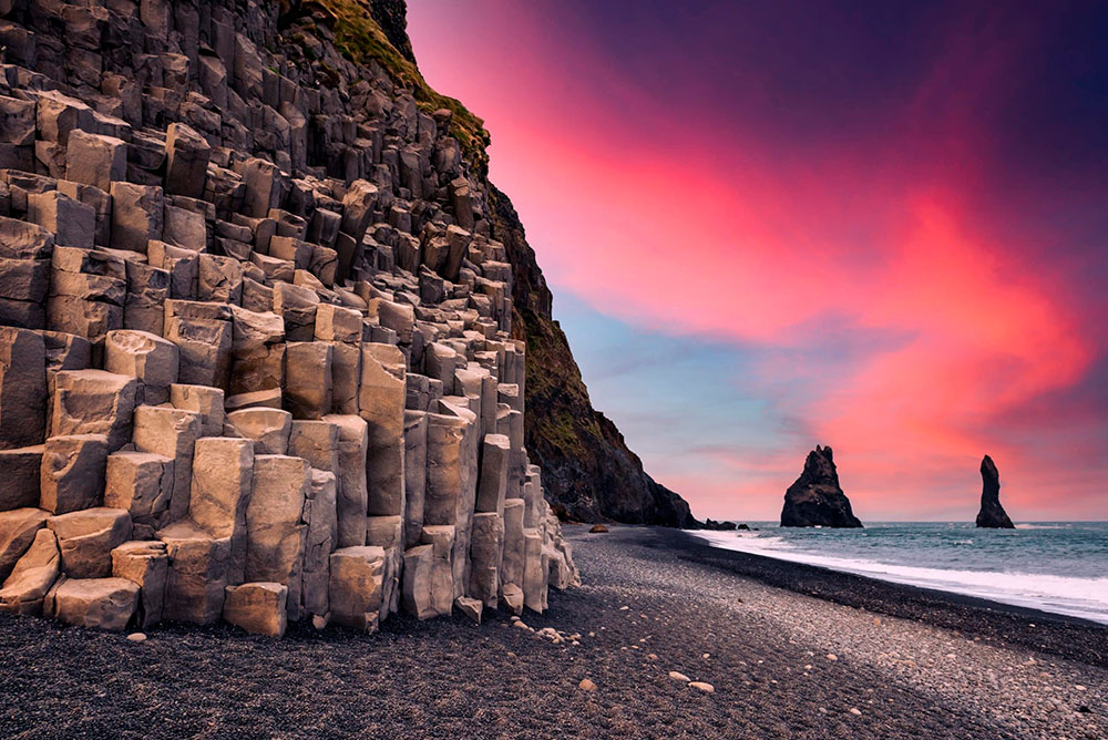 Continúa tu viaje hacia Vik, parando en el cañón Laufskálavarða y el mirador de Dyrhólaey, y visitando la playa de arena negra de Reynisfjara.
